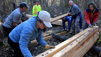 Ten people participated in this work hike, with most of them packing 2x8s to a second drop off point along the trail for installation of more plankway (likely next Spring). We also continued on to the river which was eerily low for this time of year.