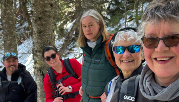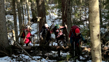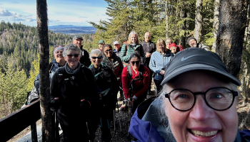 Sixteen Ramblers showed up to follow leader Rita along the various trails in Pidherny. They hiked Pappa Woods, Ridge Trail, and Northern Lights for a total of 8 km. The trails were in pretty good condition and they only needed spikes to navigate the icy patches, and climb over one blowdown.